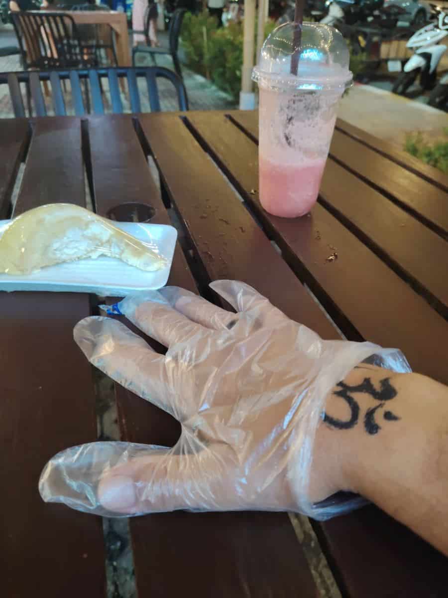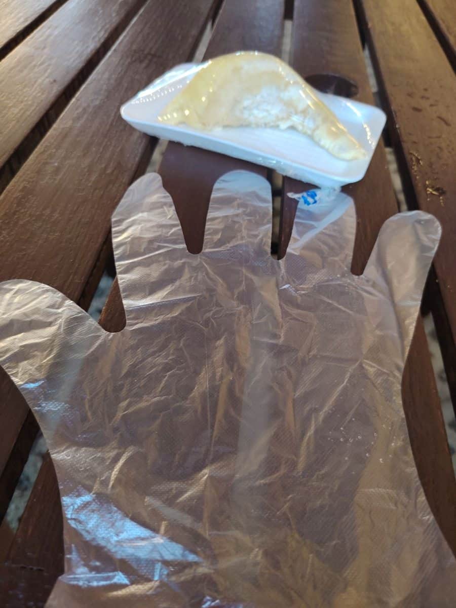Ennek a sok dolognak azért van jelentősége a történetben, hogy érzékelhető legyen, hogy kb. egy órát a táskámban volt a lefóliázott gyümölcs. Amihez egyébként az árus előzékenyen adott még egy eldobható nylon kesztyűt is, azzal a figyelmeztetéssel, hogy használjam majd ezt a kesztyűt, ha megeszem a kaját, mert elég büdös.