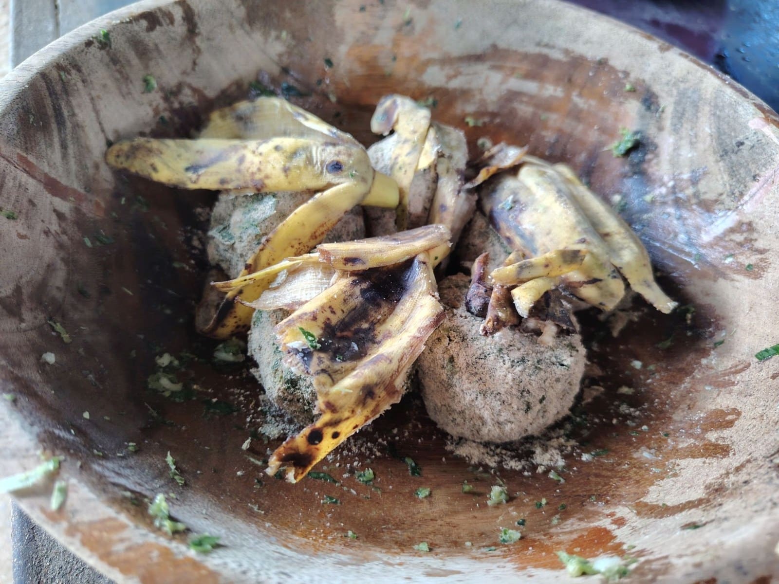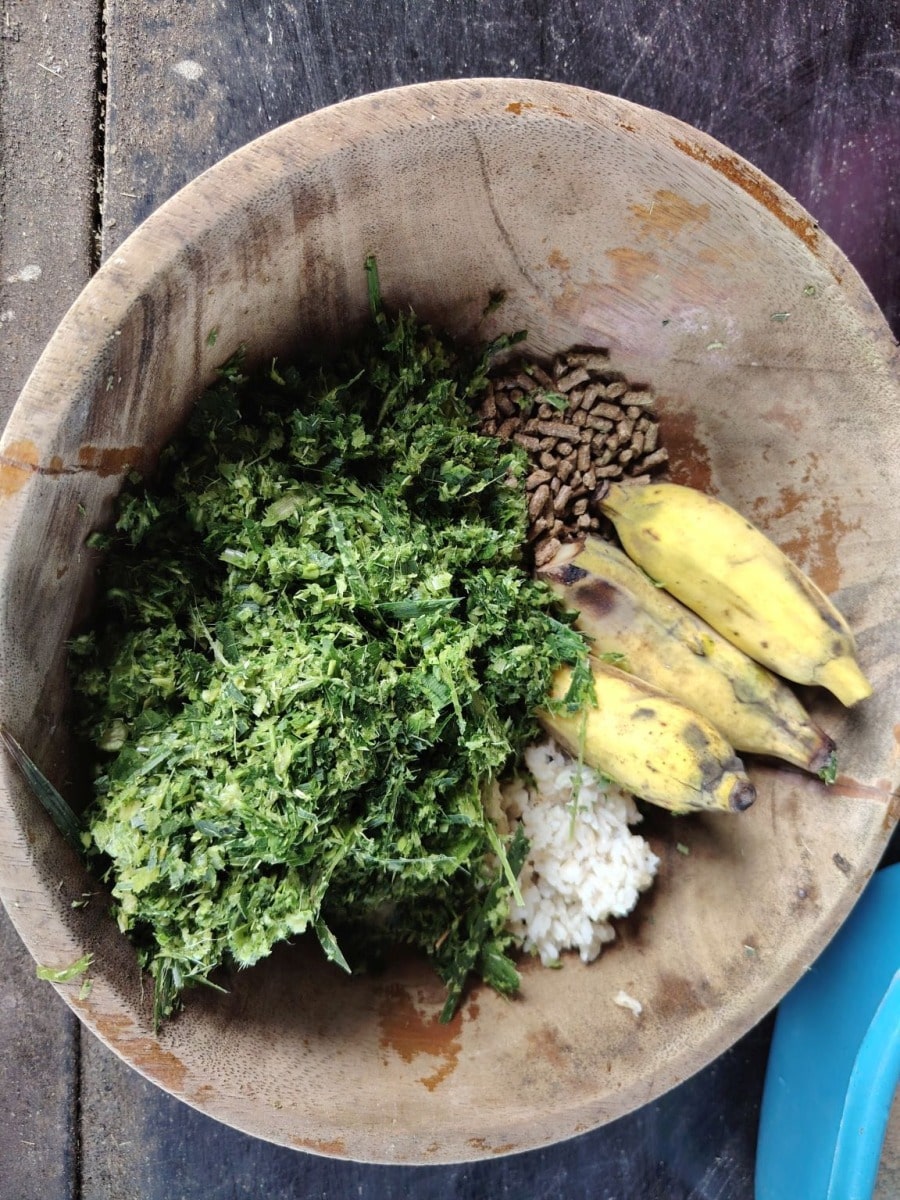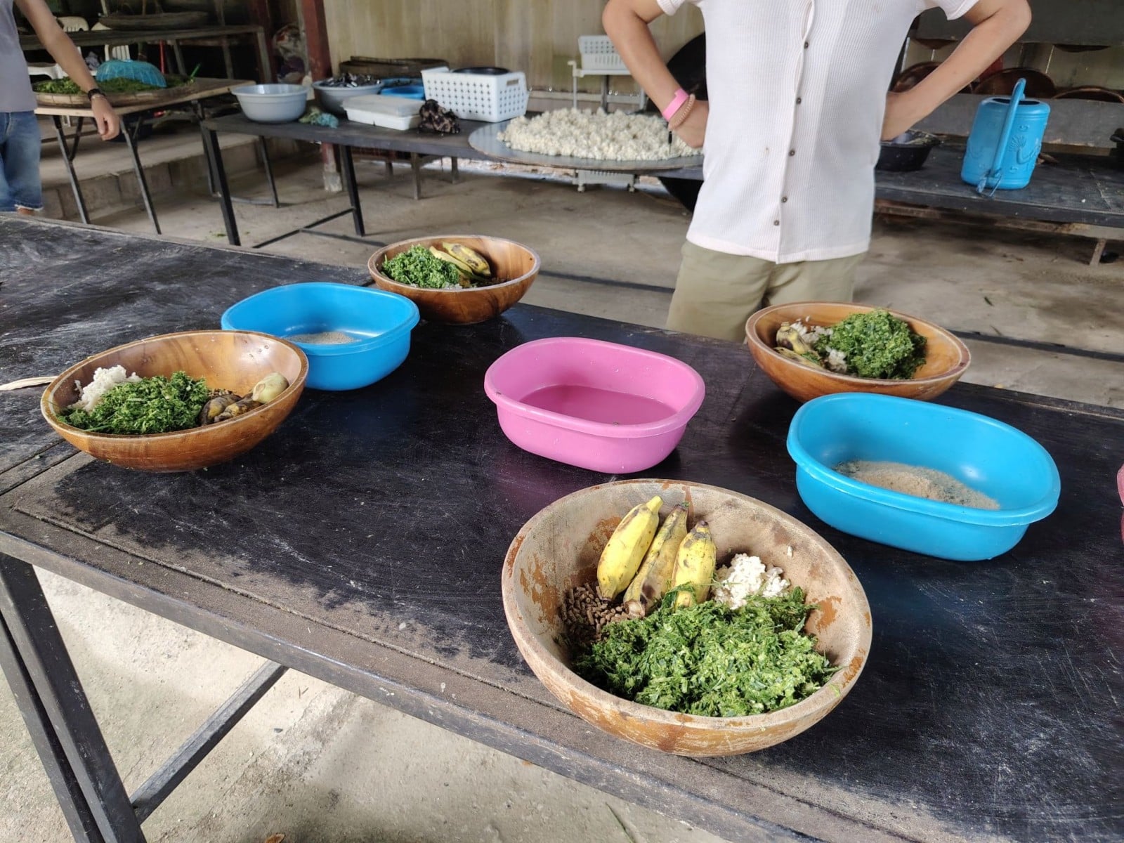 Majd – mi is öten voltunk, nem csak az elefántok – mindannyian készítettünk egy kis elemózsiát az állatoknak. Főtt rizst, füvet, banánt és granulált eledelt gyúrtunk össze 5 golyóvá, forgattunk meg rizs lisztben és díszítettük fel a banán héjával.