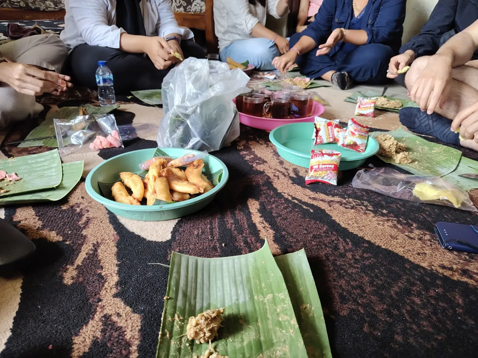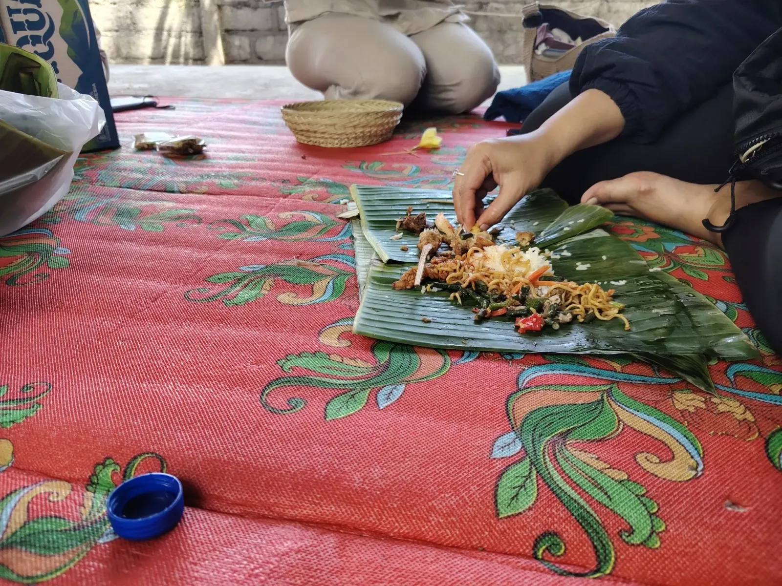 Reggelivel kínáltak minket. A földön ülve ettünk. Levélbe csomagolt ételt.