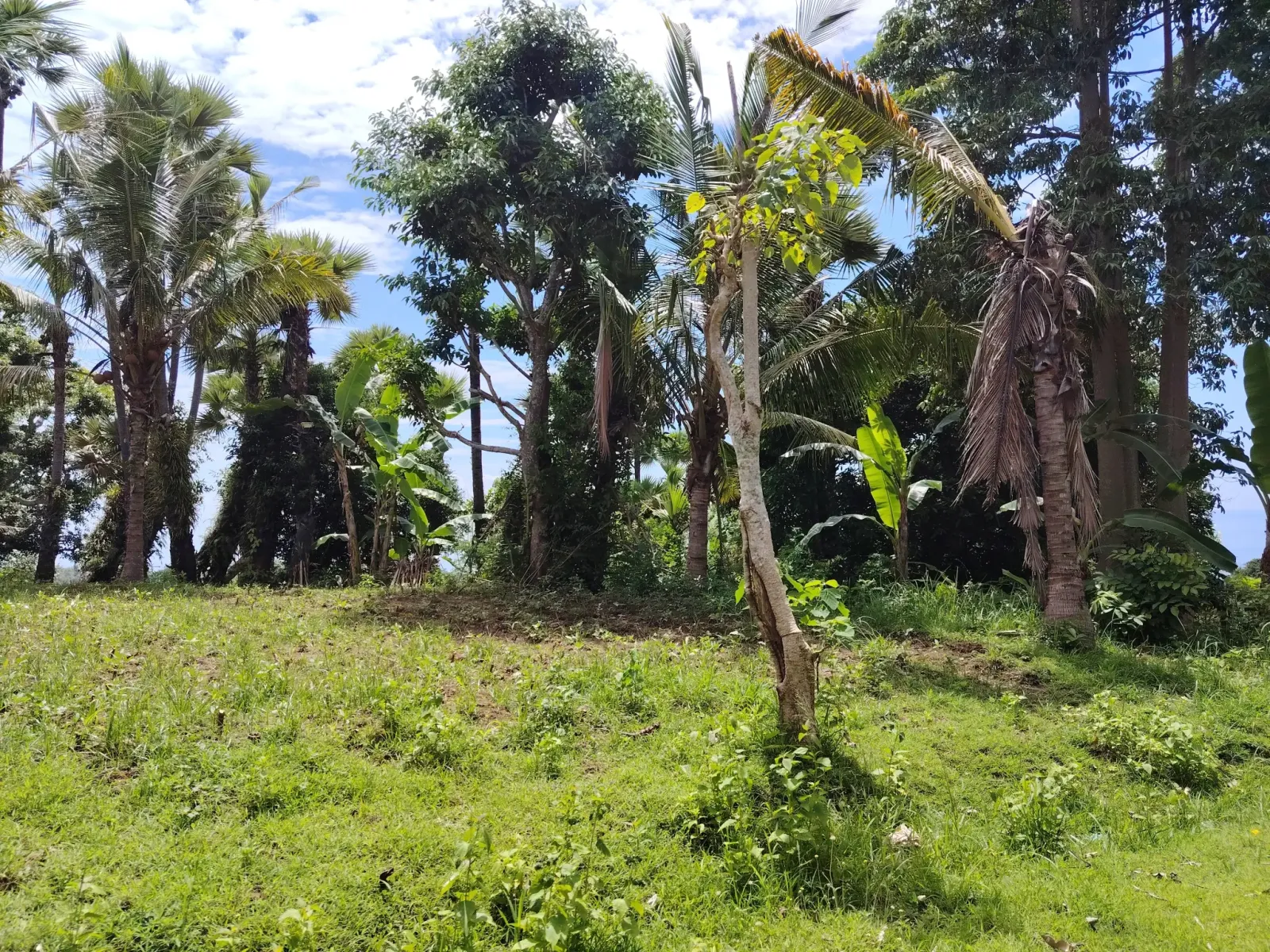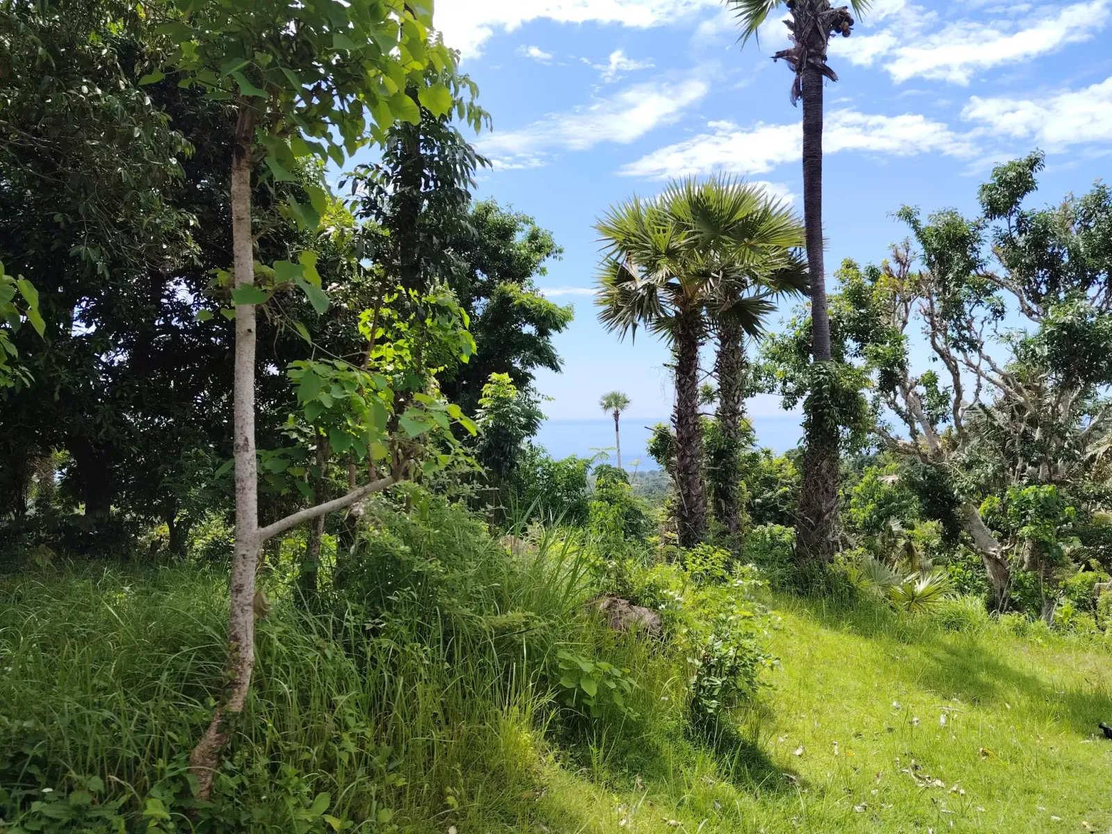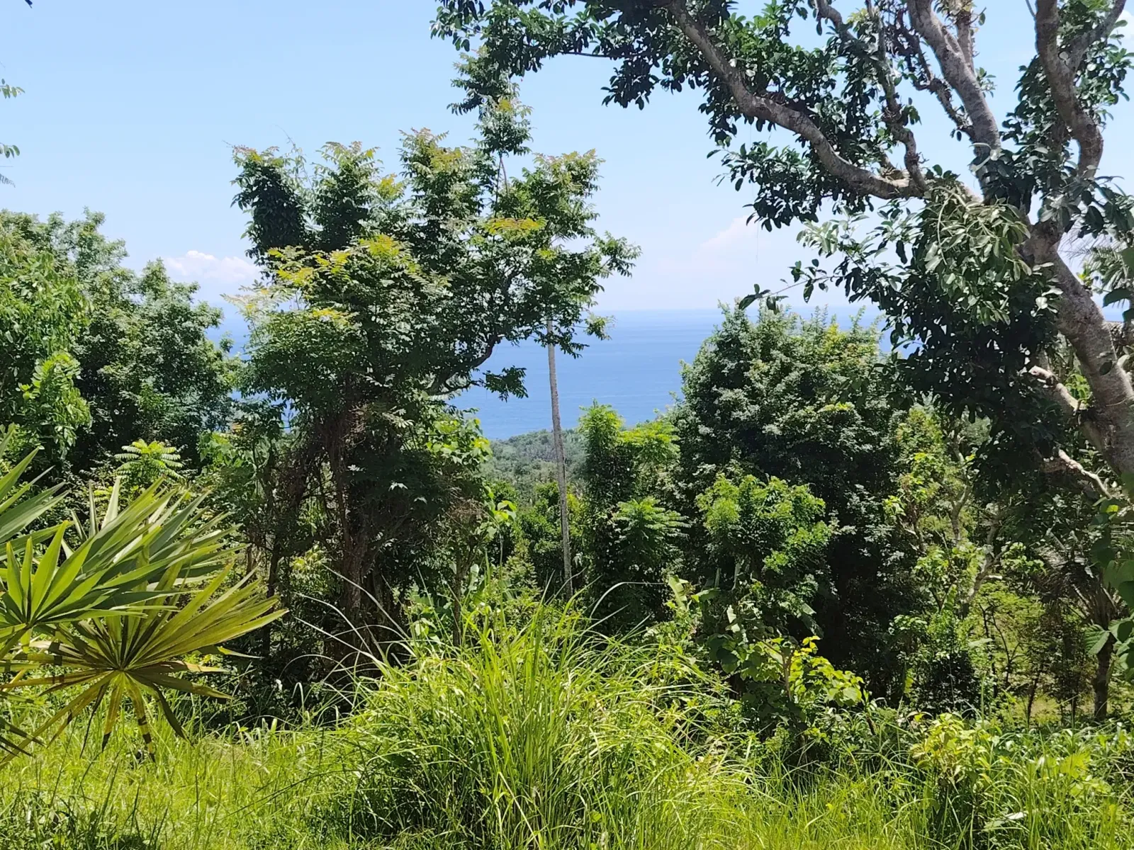 Zöld minden. A fák mögött az óceán. Fent a hegy csúcsa a felhőkben.