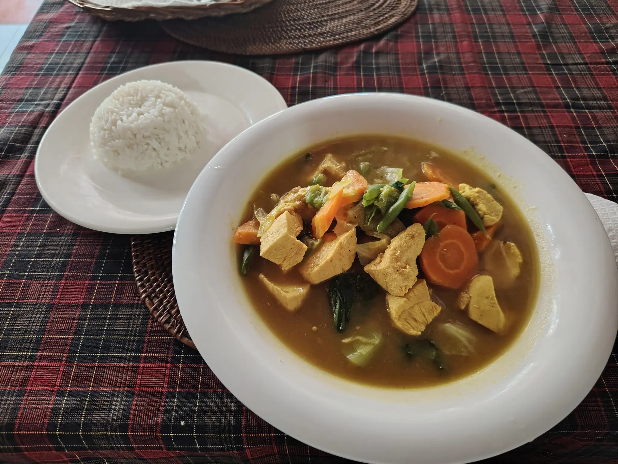 Egy curryt ettem, ami a Thaiföldön megszokott ételhez képest teljesen más. Itt inkább hasonlít a levesre, mint egy szószos ételre. Az íze viszont itt is finom, a tartalma pedig azt hiszem teljesen egészséges.