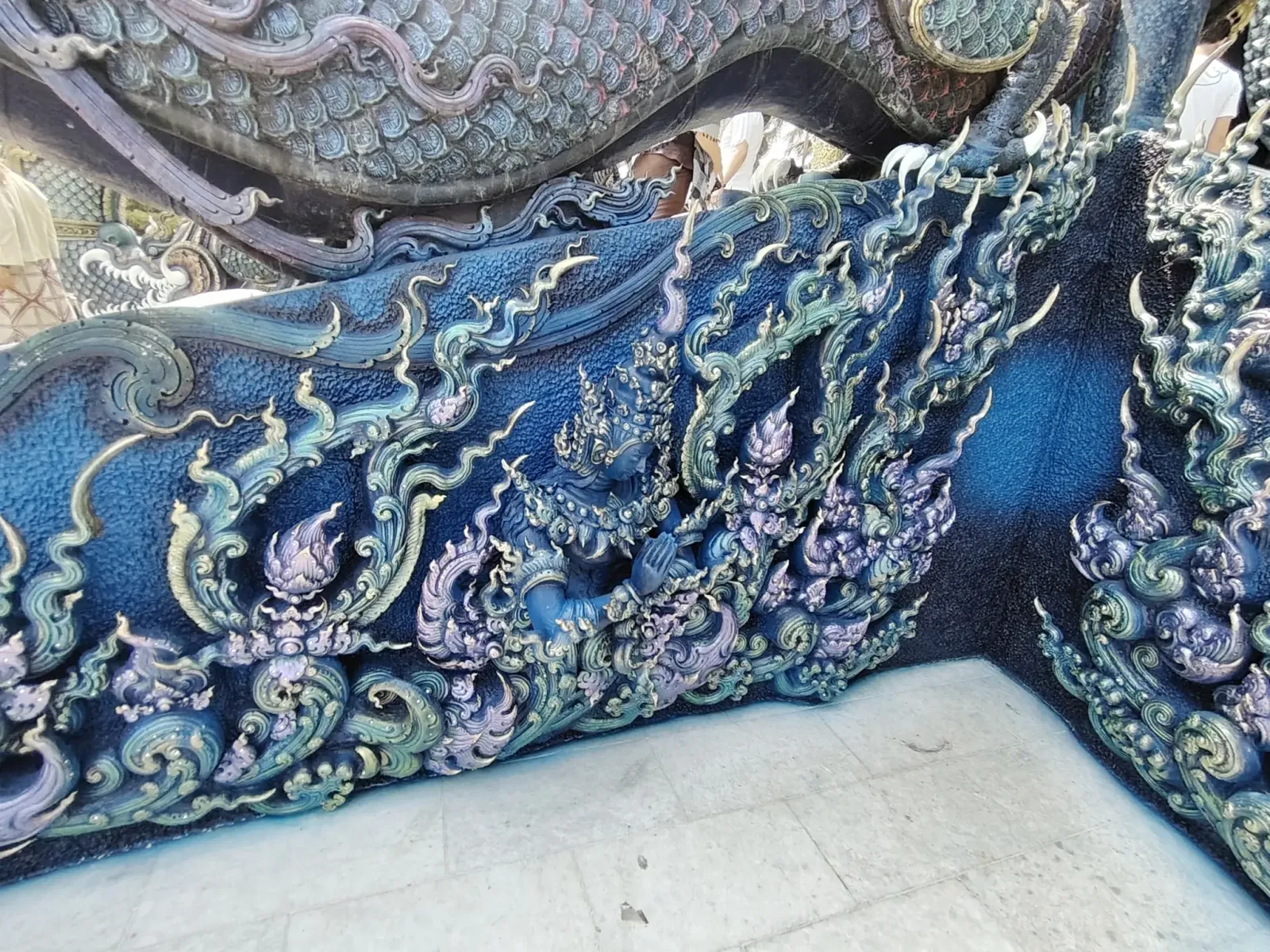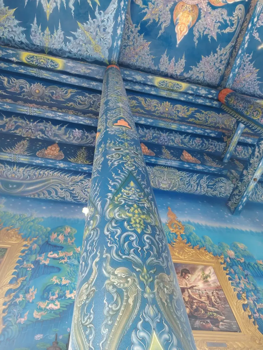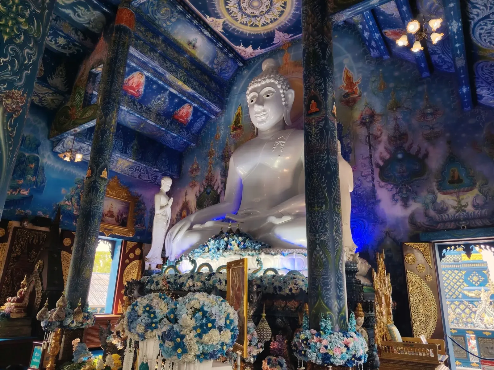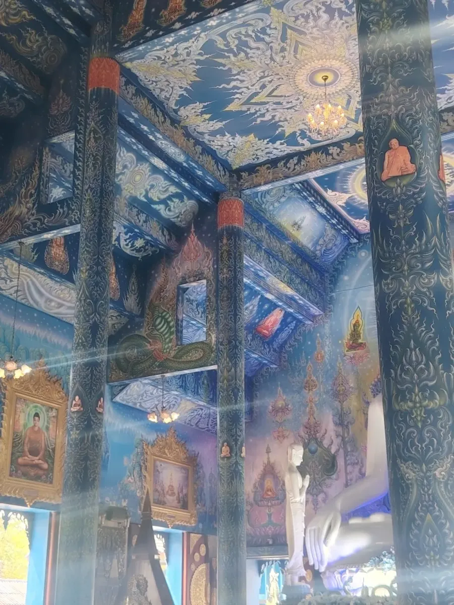 Itt Észak-Thaiföldön nem ez az első templom, amelynek a belső falai gyönyörű festményekkel vannak kidekorálva Buddha életének jeleneteivel. Kívül rendkívül gyönyörű kék szobrok őrzik a templom békéjét, így ez a kirándulás egyben egy művészeti bemutatóvá is vált.