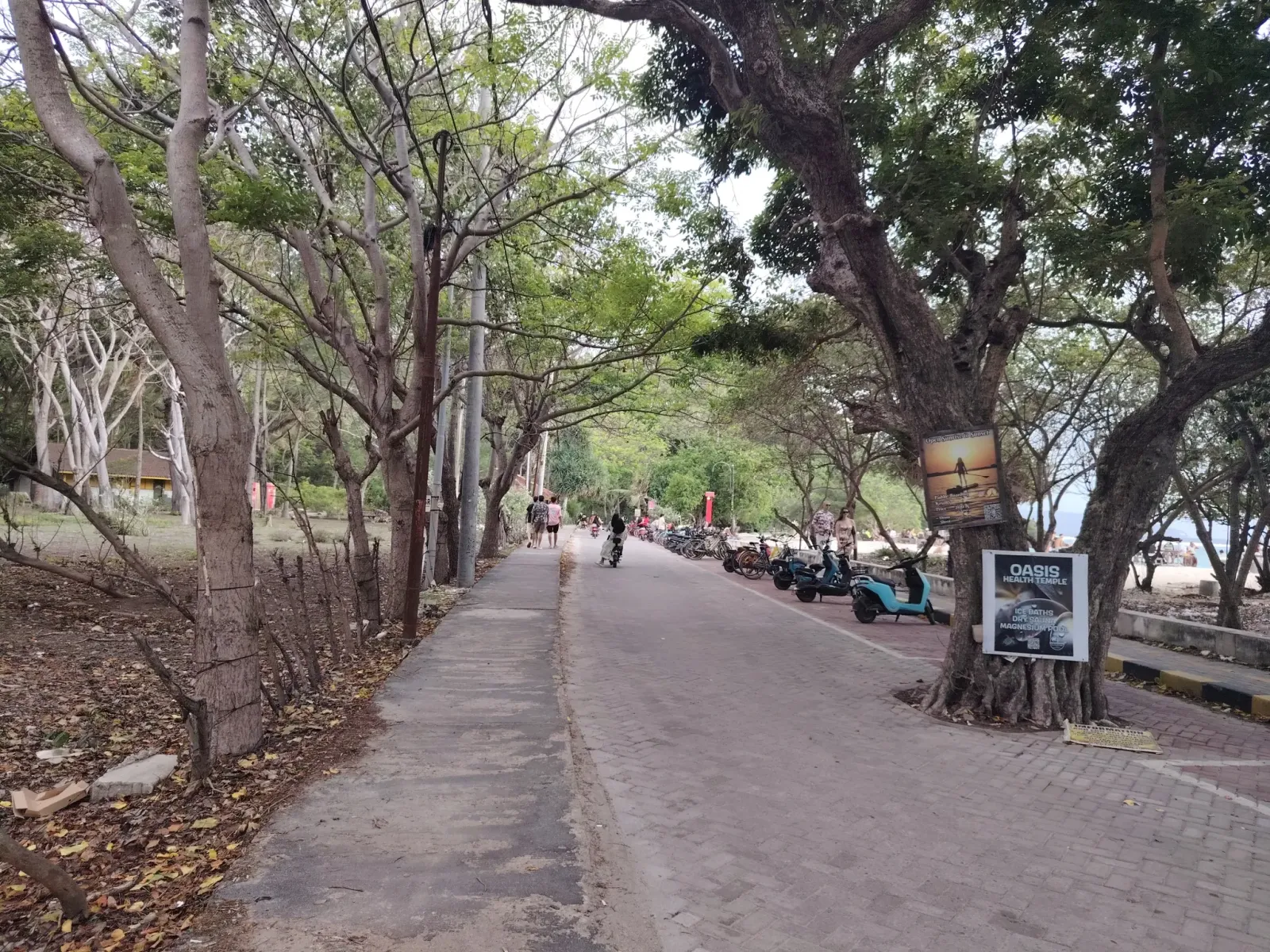A főút az óceánparton halad végig a sziget teljes hosszában. Az út és a víz között napernyők és fotelek, babzsákok százai borítják be a homokos partot. Mindenki fürdőruhában sütteti magát a napon és a többségen látszik, hogy élvezik a helyet.