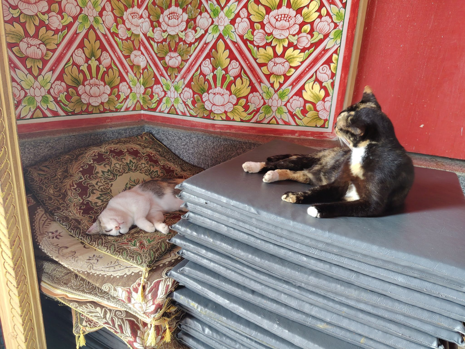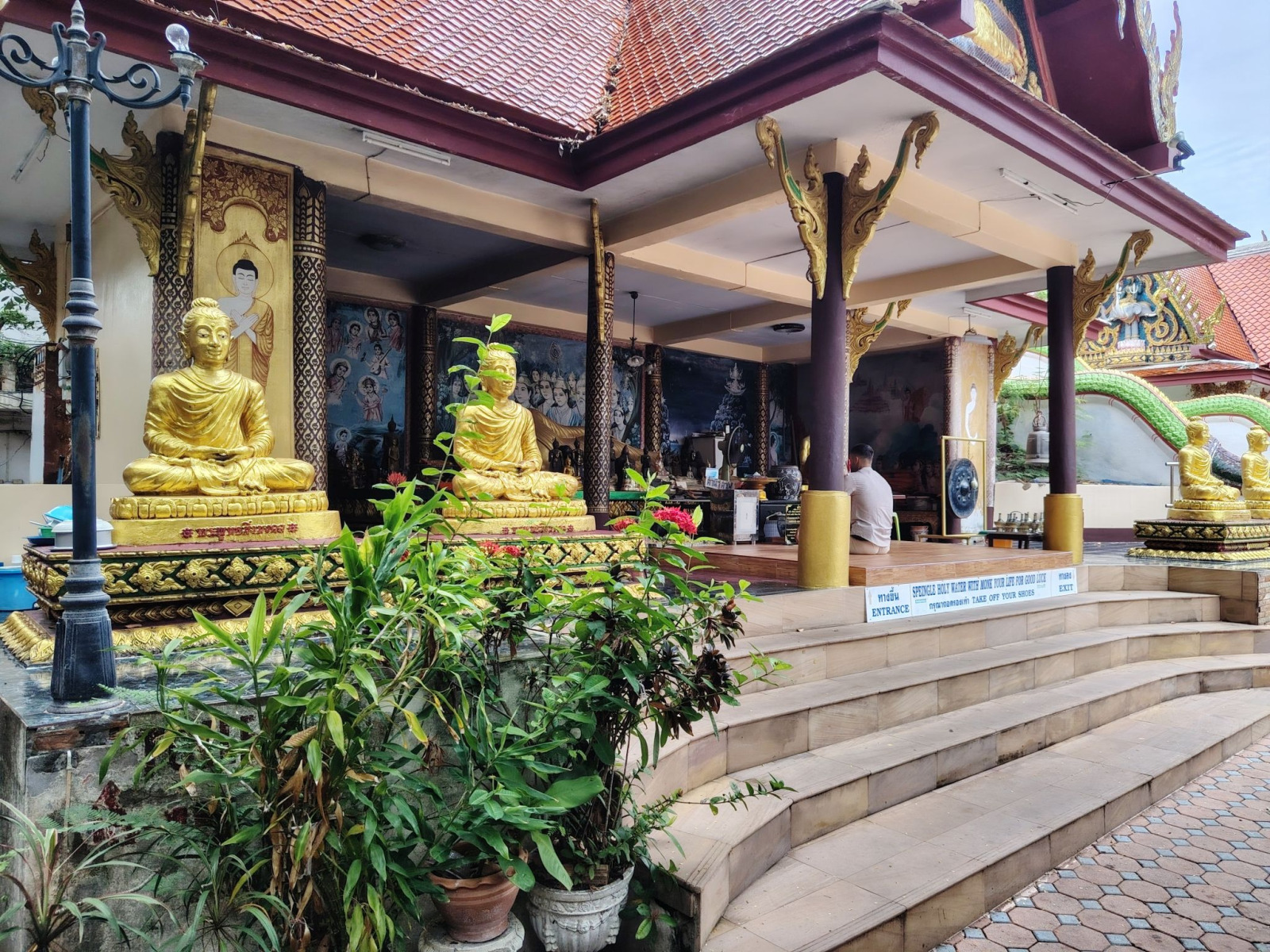 A színek kavalkádja, ami az arany mellett mindenhol megjelenik, nagyon hangulatossá teszi ezeket a helyeket. A nézelődök egy része a hozzám hasonló látogató. De itt láttam szerzetest munka közben, és láttam meditáló, elmélyülő embert a megfelelő helyen. Nem mindenki viselkedett a hely szellemének megfelelően, de azt hiszem, ez így van mindig.