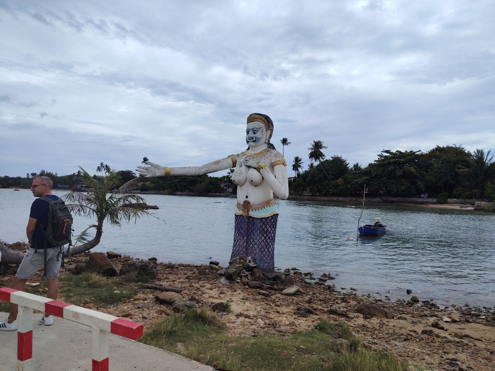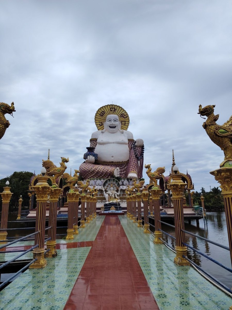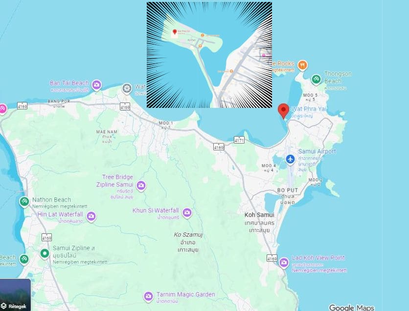 Ebből a leírásból tudtam meg azt, amit eddig nem vettem észre, nevezetesen azt, hogy ez a szobor egy kis szigeten van. Tulajdonképpen a Koh Fan szigetet Koh Samui szigettel összekötő töltésen üldögéltem, mikor a “Villámok a sziget felett” bejegyzésben írottakat átéltem.