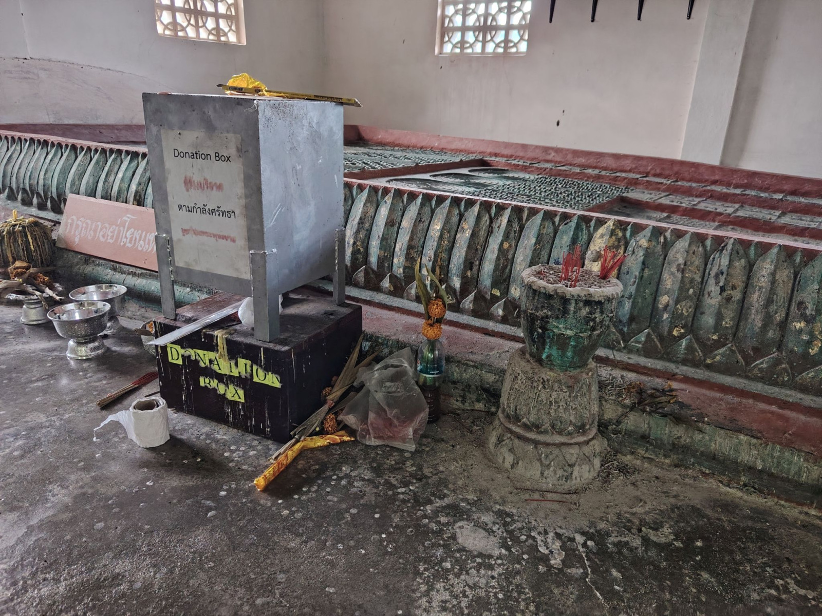 Tényleg békés hely volt. Itt tartottam egy kis szünetet a fényképezés után. Egy picit még aludtam is az egyik padra hajtva a fejem. Több látogató is jött ide, amíg ott voltam, de mindenki thai származású volt. Ami annyiban nem igaz, hogy a Buddha lábnyománál találkoztam egy sráccal, akivel ott is köszöntünk egymásnak, itt meg a viszont látás örömére beszélgettünk kicsit. Ő volt rajtam kívül az egyetlen európai ember ezen a helyen. Hello Ed, Angliából!Az első két bekezdés leírásában olvasható dolgok mind igazak. A templomkert a maga elhagyatottságával még most is méltóságteljes. Kicsit meg is el is időztem a kertben, keresve a jobb idők nyomait. A kert mellett volt egy épület, kedvem lett volna bemenni, de nem itt akartam elkezdeni a betörő szakmát.