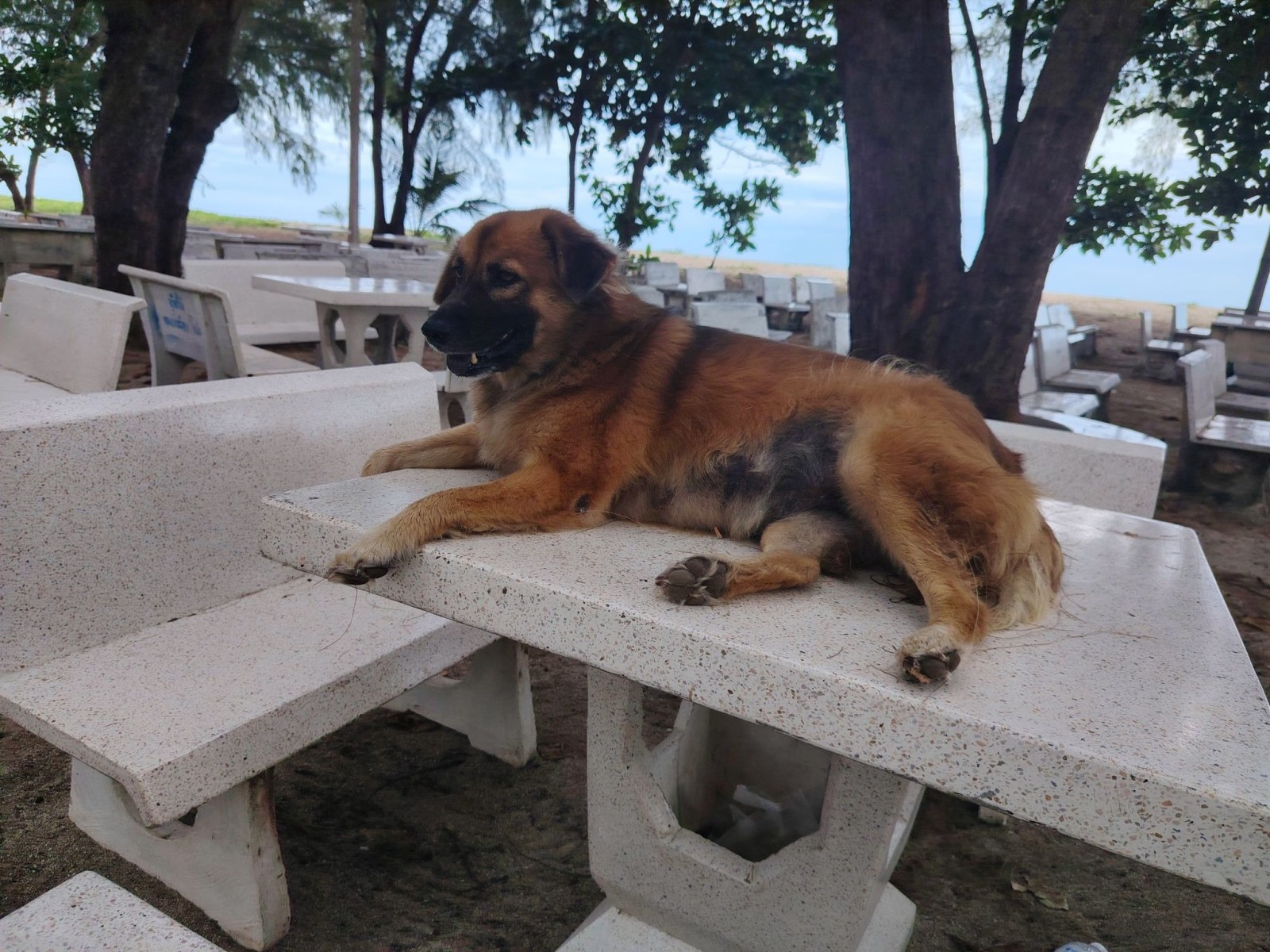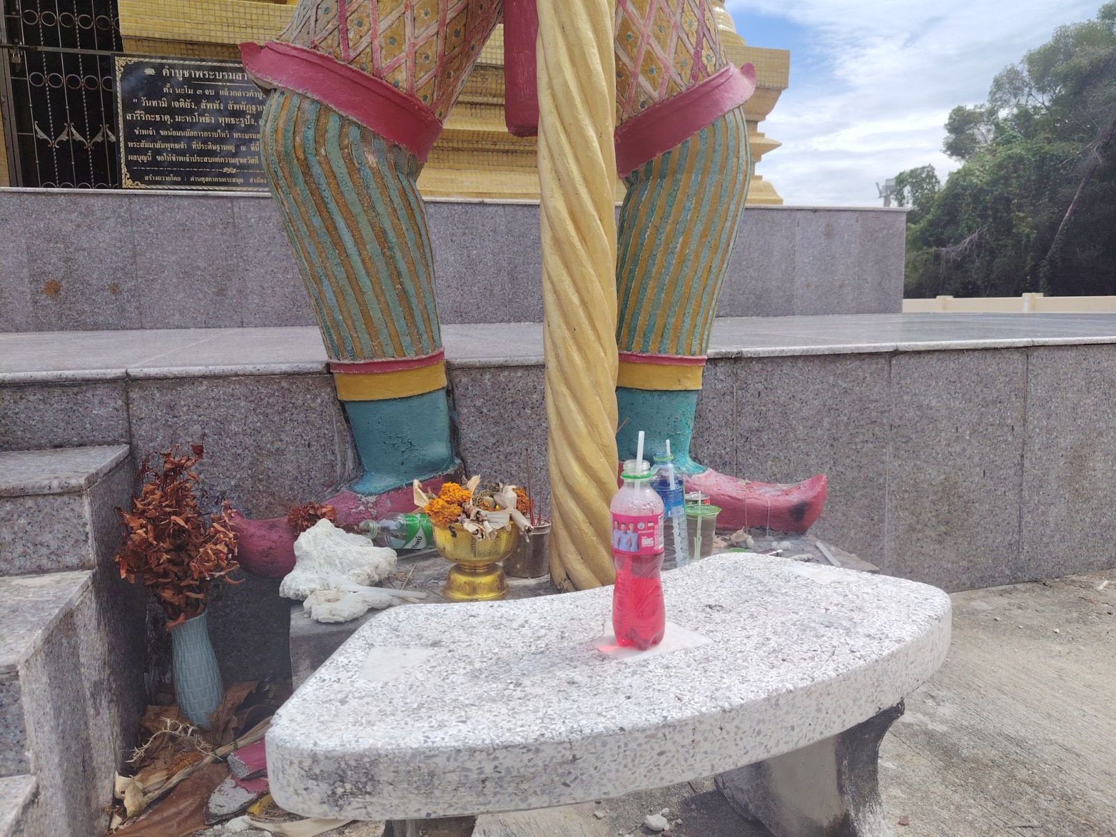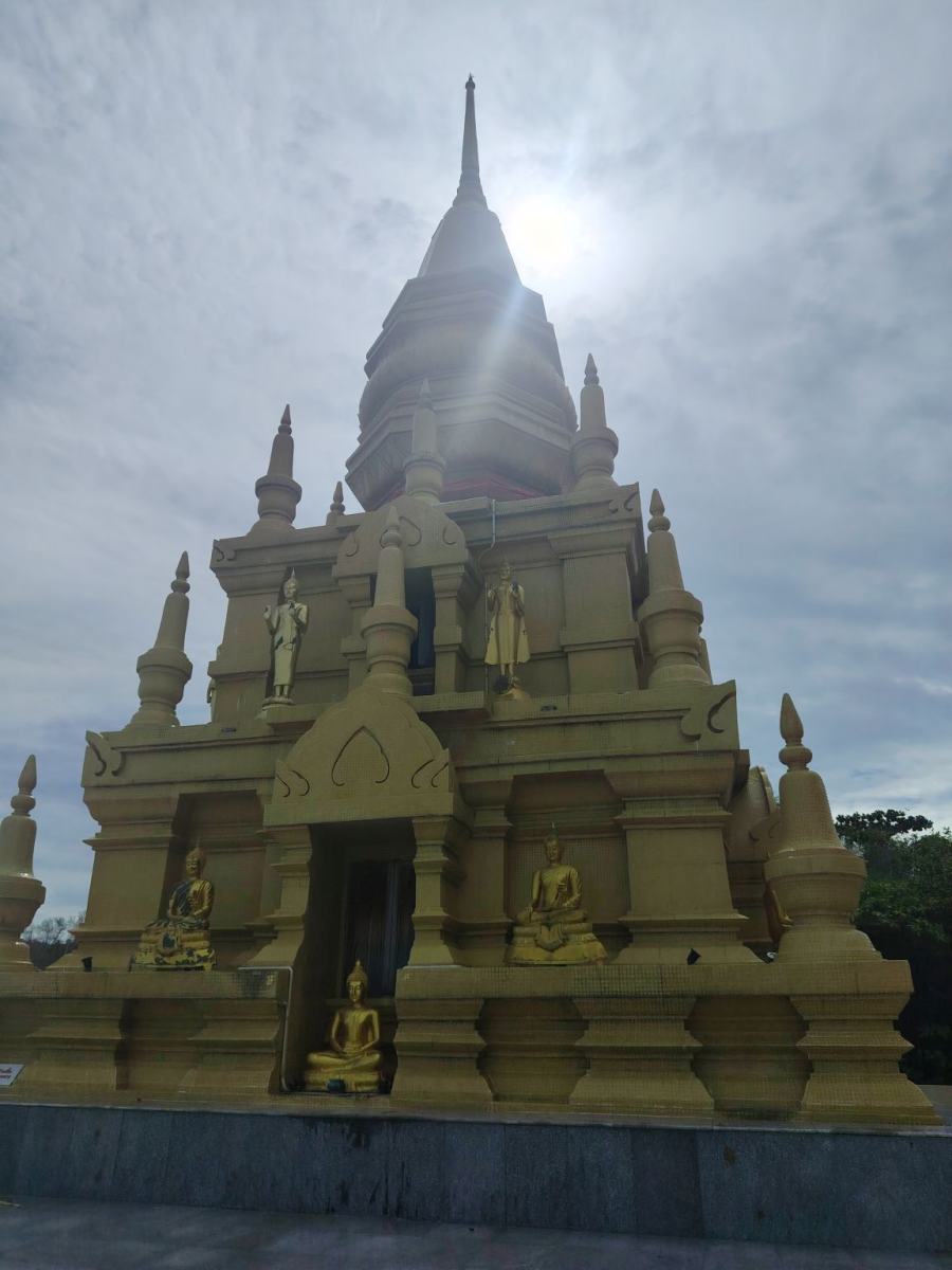 A sztúpa is fenséges látvány, nagyon furcsa a magánya a tenger előtt. A park, ami a helyhez tartozik meg egyszerűen mennyei. Mikor egy kicsit pihentem, s indulni akartam, megláttam a parkolóban két thai hölgyet a motorjaikkal. Az egyik grillezett ételt árult, az illata nagyon szépen terült el a parkban. Nem is nagyon érdekelt, mi az, vettem egy adaggal és megettem az egyik kis asztalkánál ülve. Egy maréknyi kolbász féleség volt, amihez kaptam egy másik marék zöldséget, meg egy fél marék csipős paprikát. Ez igazi kihívás volt, de megettem. Két kutya azonnal odajött hozzám, nem amikor leültem, hanem amikor kifizettem az ételt. Ezek nagyon képzett kutyák voltak. Értettek a cukin nézéshez is, így nem volt szívem nem adni neki, így végül hármasban fogyasztottuk el a grillezett golyócskákat.