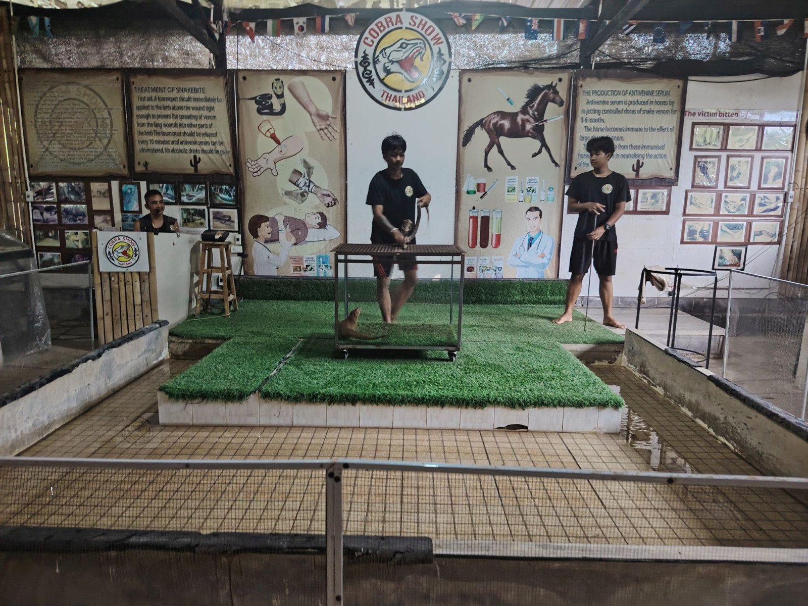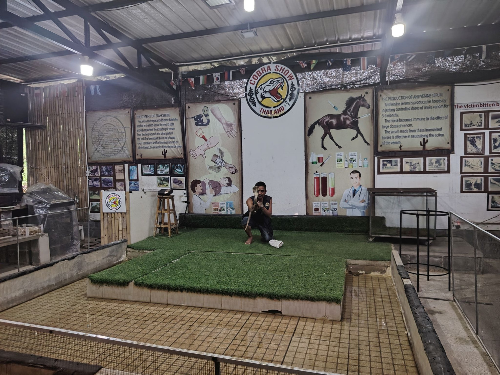 Itt nem tudtam igazán jó képeket készíteni. Inkább az élmények domináltak. Először is – ilyet még soha nem tapasztaltam -, mikor megjött az egyik kigyóbűvölő (mint később kiderült, 18 éves) fiatalember, pár szót váltottunk. Körülbelül annyit, hogy honnan jöttem, hogy vagyok. Aztán a kezembe nyomott egy mini fagyit, hogy nem kérem? Neki van kettő darab, ezt nekem adja…Kicsit várnunk kellett, addig alaposan megnéztem a terráriumok lakóit. Aztán betessékeltek hármunkat a ring szélére és elkezdődött a SHOW!
