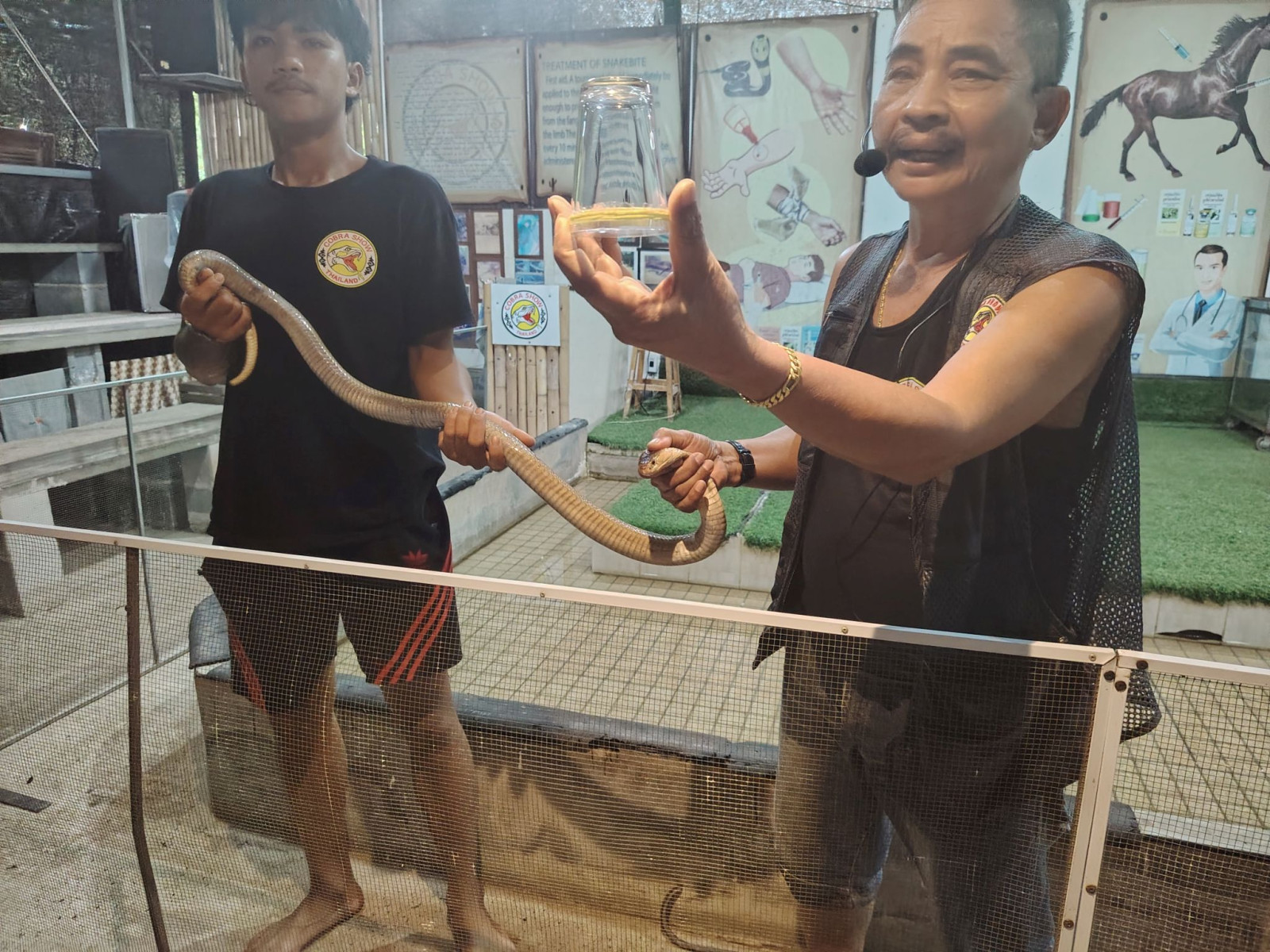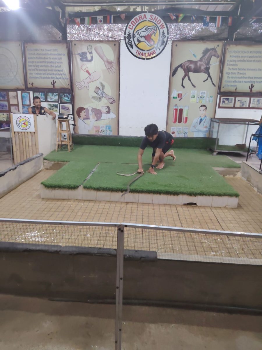 Igazán élvezetes volt, a három emberi szereplő közül a legidősebb volt a porondmester. Edukációval kezdett, nagyon szép összefoglalót tartott a kígyók viselkedéséről. Annyit tudok mondani, hogy ha ezután kígyóval találkozom, akkor nem fogok elszaladni. Akkor nem lesz baj. Nem tartott sokáig a képzésünk. Utána gyorsan meg is mutatta, hogy miről beszélt. Ehhez egy kobrát hívott segítségül. Ezt úgy szokták mondani, hogy nézni is rossz volt. Szóval, mikor a kobra – aki kígyó lévén nem rendelkezik hangképző szervvel, így az órán kifújt levegővel ad ki hangot – a folyamatos hergelés után megugrik az ember felé, én szarom össze magam helyette. Ő meg holt nyugodtan megfogja a kobra fejének hátsó részét, mert azt a mozdulatot a kígyó nem látja. Ahogy a homlokát sem.