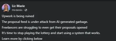 Jó volt visszaigazolást kapni egy reklámból, hogy jó a megérzésem és az UpWork használhatatlan, ahogy a képen is látható, az AI által generált hamis állásajánlatok teszik lehetetlenné a normális működését.